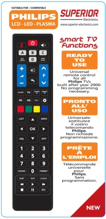 Universal remote control for all Philips TVs produced after year 2000. Ready to use, no programming necessary. 4 All standard & advanced functions and keys of your original remote control are included.